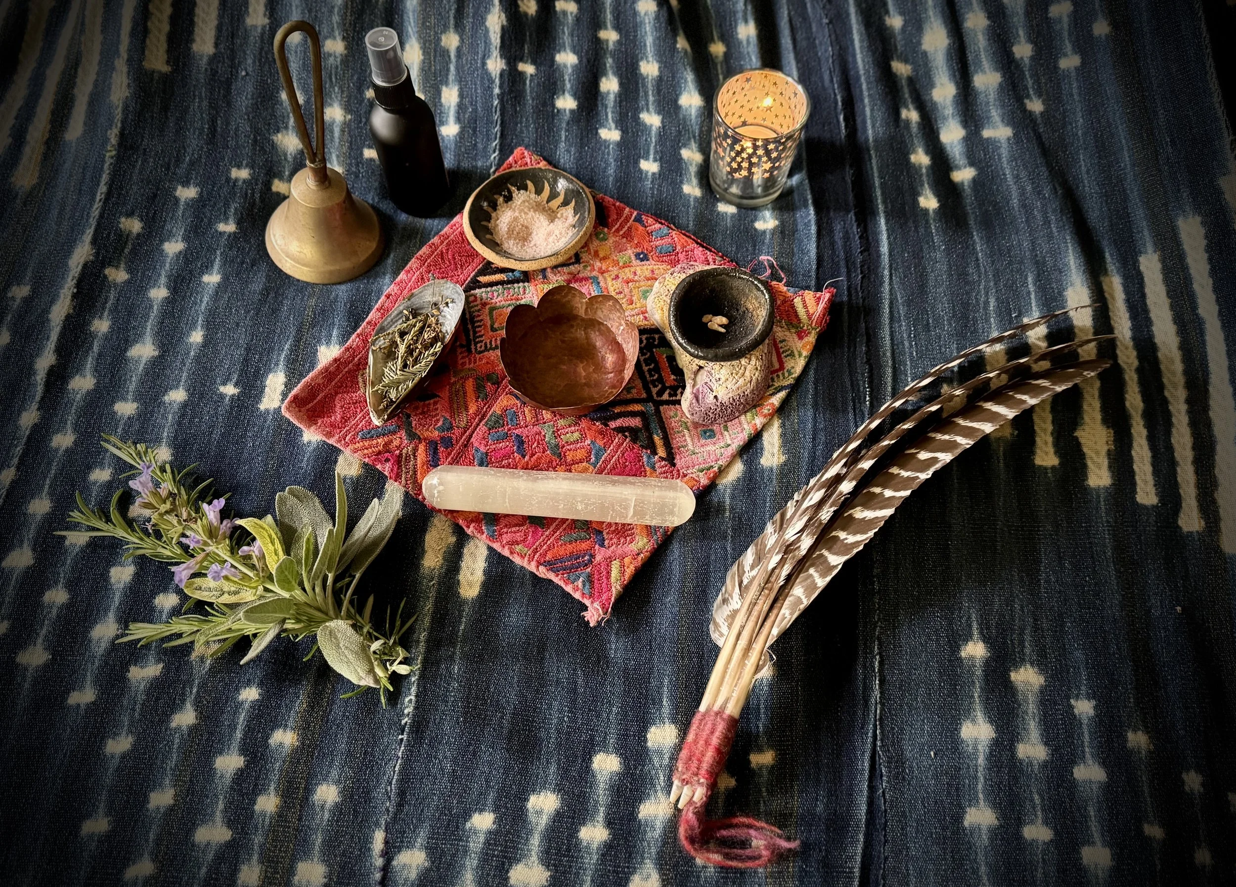 This altar uses representations of the elements of Earth, Air, Fire, Water, and Spirit, as well as tools for the clearing and imbuing (herb bundle, feather fan, ancestral bell, vibrational preparation spray). My space clearing and imbuing altars vary and rely upon intuitive sense as guidance for the application of my training and tools.